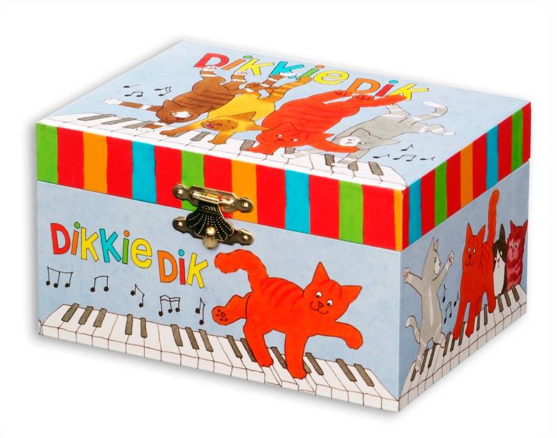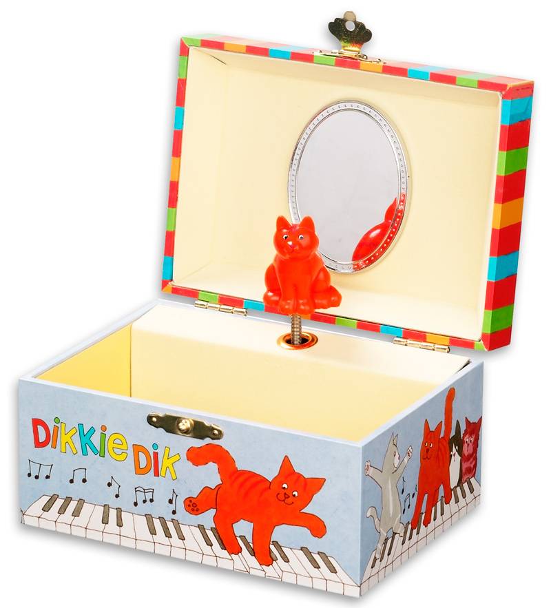 Muziekdoosje met opbergmogelijkheid en afbeeldingen van Dikkie Dik en zijn vriendjes. Als je het doosje opent, draait Dikkie Dik voor de spiegel terwijl de muziek speelt. Dit is een artikel om te koesteren en bewaren.