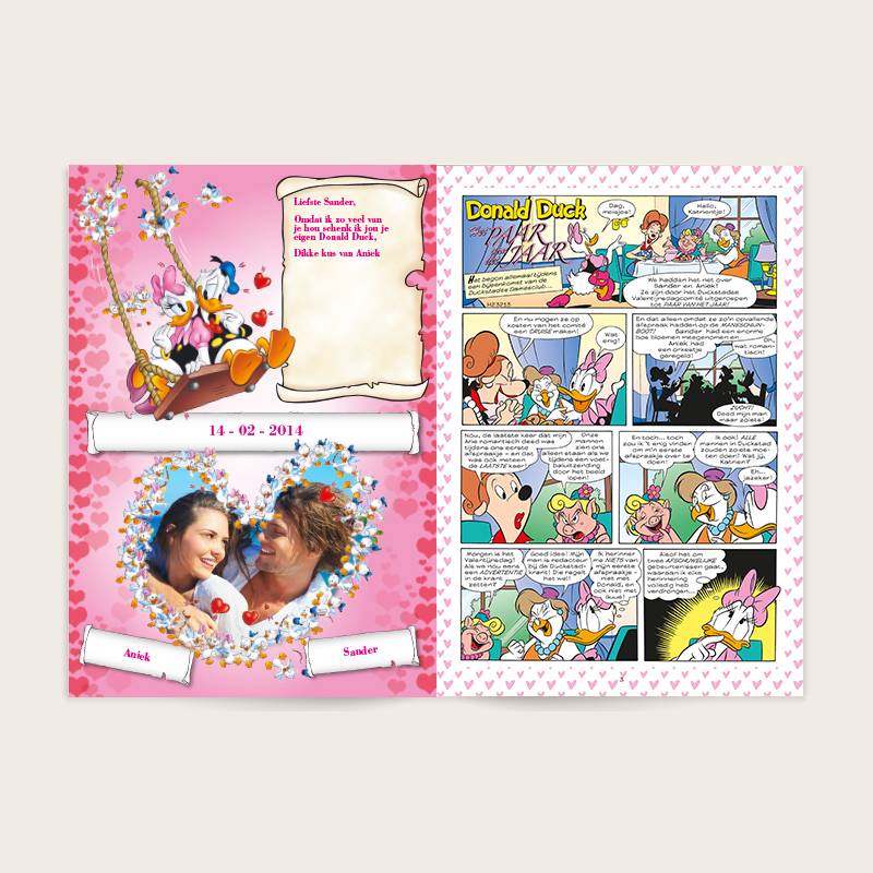 Laat iemand een rol spelen in de avonturen van Donald Duck en verras hem of haar met een gepersonaliseerde liefdes Donald Duck. Zeer geschikt als Valentijns cadeau, Moederdag cadeau, huwelijks cadeau of gewoon omdat je iemand heel erg lief vindt.