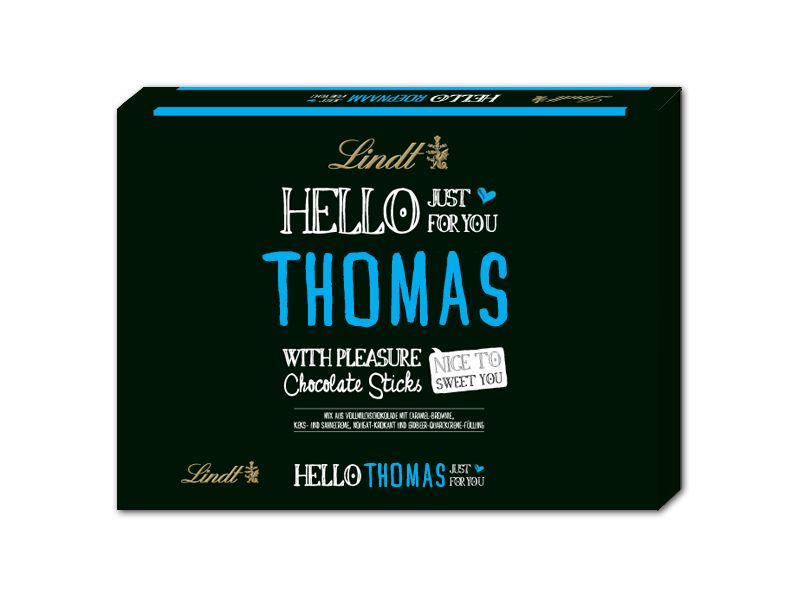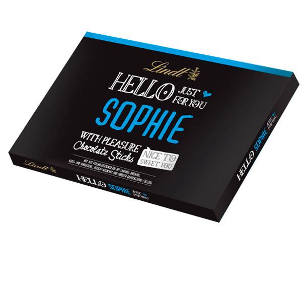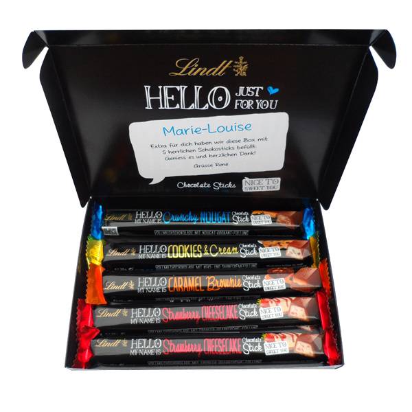 De verpakking is persoonlijk en uniek in vele opzichten. De naam van de ontvanger komt op verrassende plaatsen terug op de verpakking. Zeg HELLO en schrijf een persoonlijke boodschap die op de binnenzijde van de verpakking wordt afgedrukt. Deze luxe HELLO-LINDT chocolade verpakking bevat 5 LINDT chocoladesticks: - Strawberry Cheesecake (2 st.) - Nougat Crunch - Cookies & Cream - Caramel Brownie