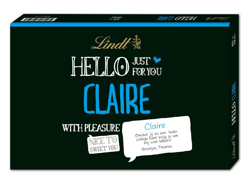 De verpakking is persoonlijk en uniek in vele opzichten. De naam van de ontvanger komt op verrassende plaatsen terug op de verpakking. Zeg HELLO en schrijf een persoonlijke boodschap die op de binnenzijde van de verpakking wordt afgedrukt. Deze luxe HELLO-LINDT XXL chocolade verpakking bevat 4 LINDT chocoladerepen: - Strawberry Cheesecake - Nougat Crunch - Cookies & Cream - Caramel Brownie