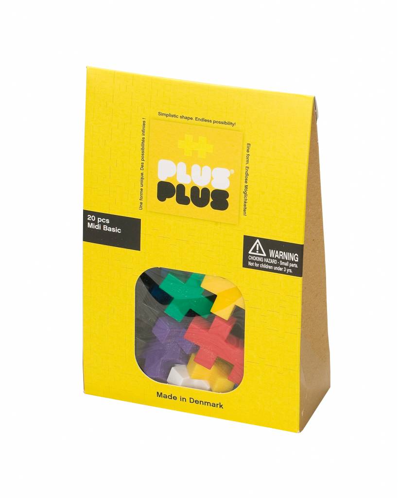 Hierin zitten 20 Plus-Plus midi bouwsteentjes met de kleuren blauw, wit, zwart, oranje, groen, paars, geel en rood in een mix.