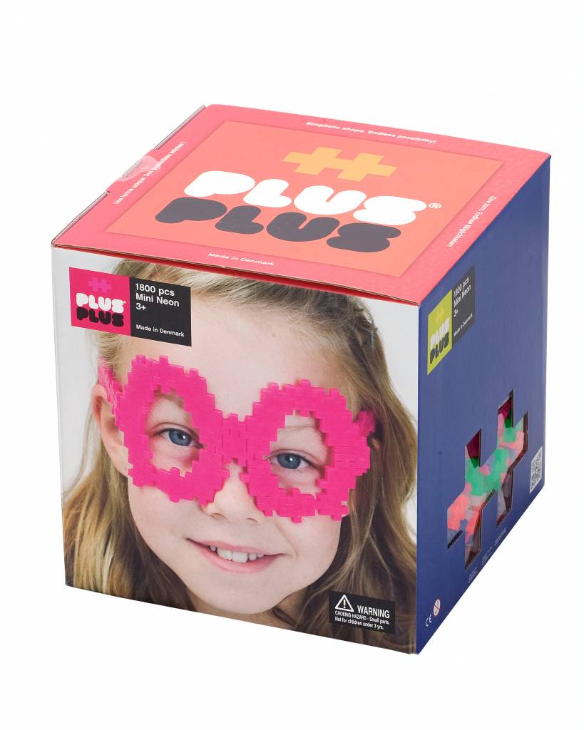 Hierin zitten 1800 Plus-Plus mini bouwsteentjes met de neonkleuren blauw, wit, roze, groen, oranje en geel in een mix.