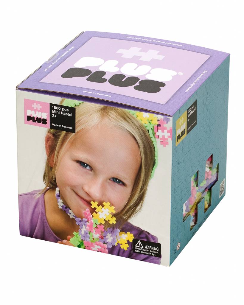 Hierin zitten 1800 Plus-Plus mini bouwsteentjes met de pastelkleuren blauw, wit, groen, paars, geel en roze in een mix.
