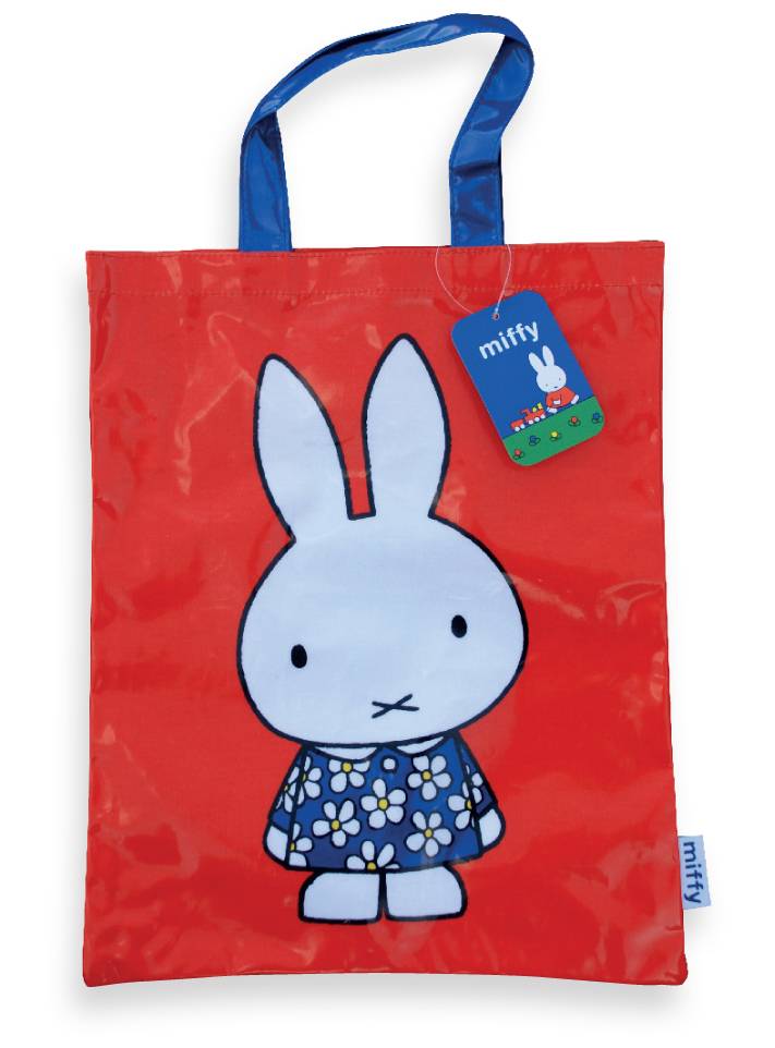 Gelamineerd katoenen tas van nijntje. Door de gelamineerde buitenkant kan de tas tegen een stootje, en veeg je ongelukjes zo van de tas van.