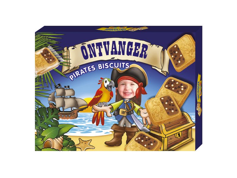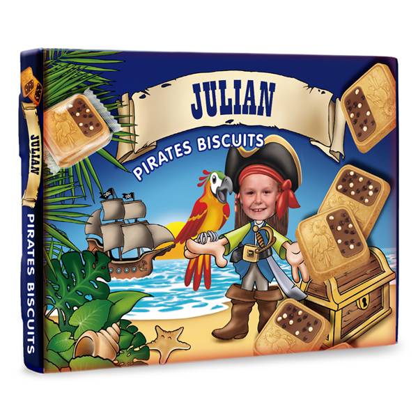 U verwent uw kind met deze piratenkoekjes in eigen stoere piratendoos met eigen naam, en leuke persoonlijke boodschap optiioneel mét foto.