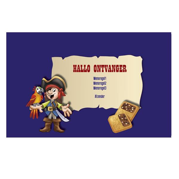 Een eigen stoere piraten koekjesbox met naam en persoonlijke boodschap.