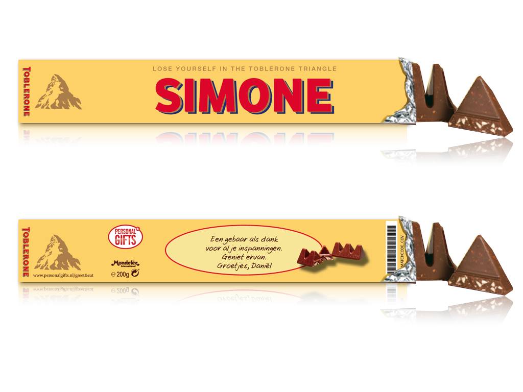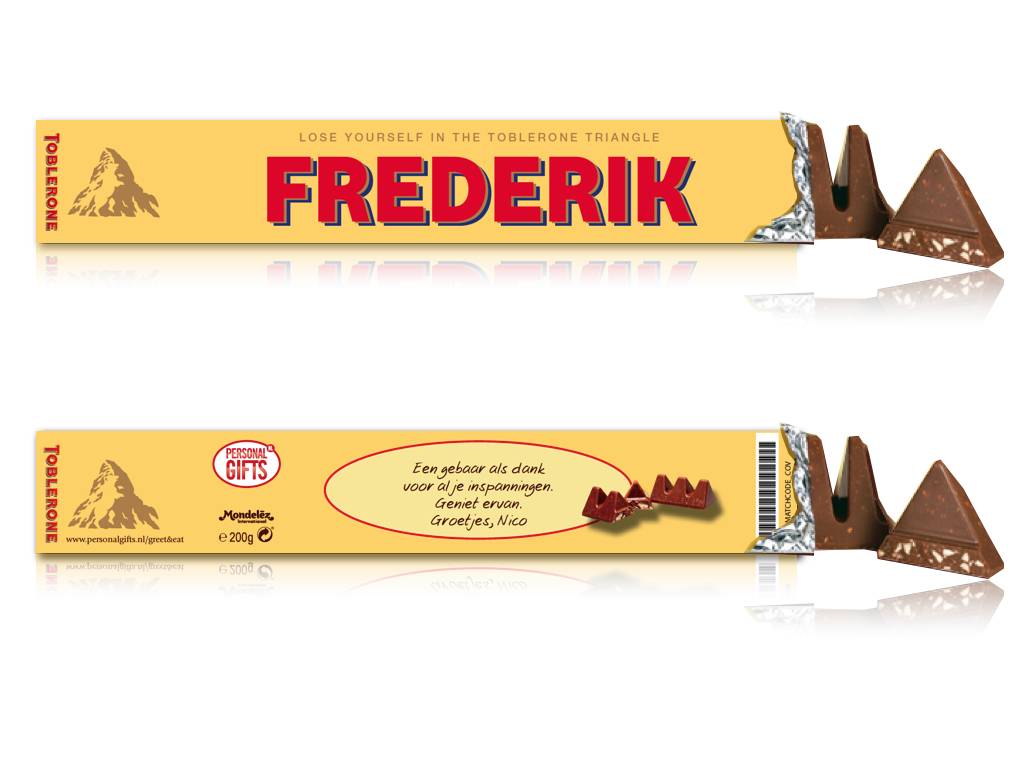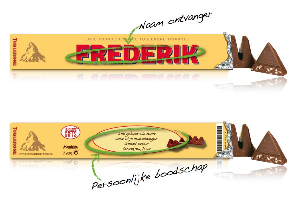 De naam van de ontvanger of je slogan, komt op de twee schuine buitenzijdes, je persoonlijke boodschap komt aan de onderzijde. De originele Toblerone chocolade wordt voorzien van een gepersonaliseerde sleeve. De sleeve wordt in full color geprint en voorzien van een hoogglans folie. Top chocolade gehuld in een super sleeve! Je eigen Toblerone staaf wordt binnen enkele dagen per post bezorgd.