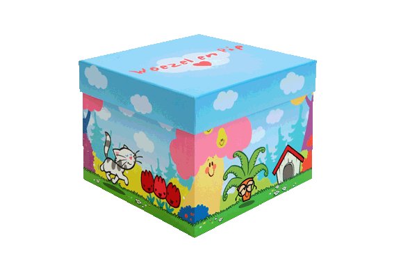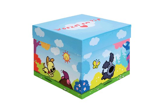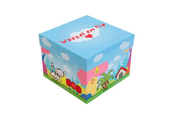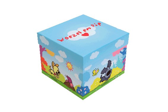 Een stevige, kartonnen vierkanten doos met vrolijke Woezel en Pip afbeeldingen.