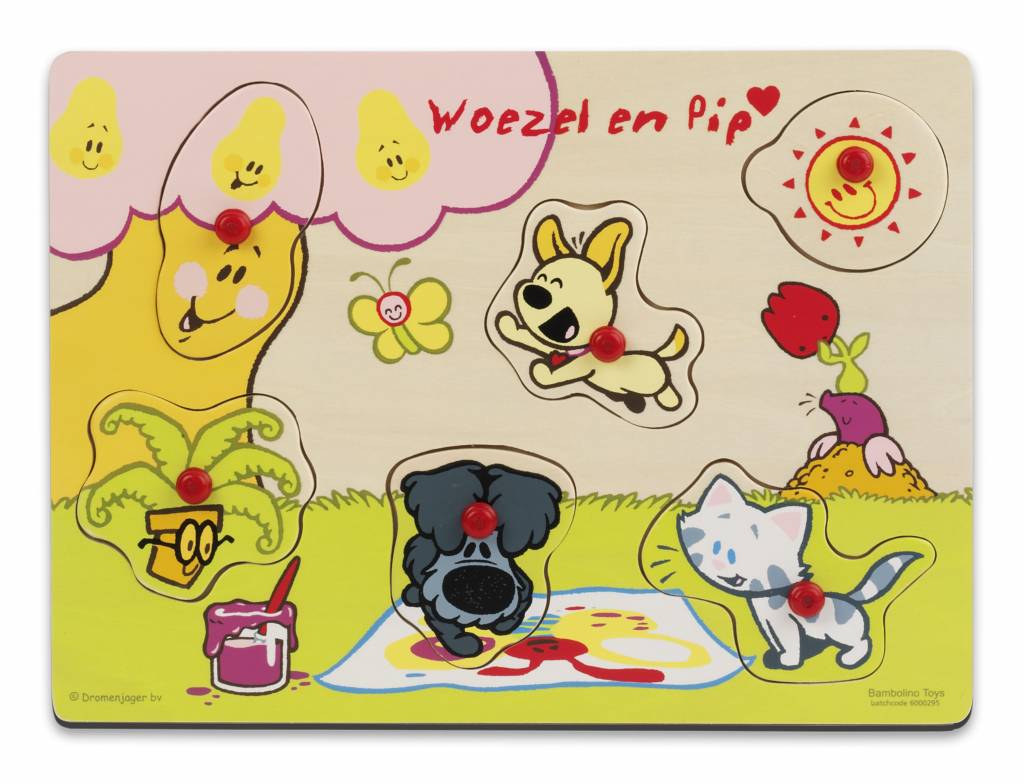 Woezel en Pip knopjespuzzel van hout met een vrolijke, zonnige afbeelding van Woezel en Pip in de Tovertuin. De ideale eerste puzzel voor uw (klein)kind met 6 puzzelstukjes van de allerliefste hondjes van de wereld.