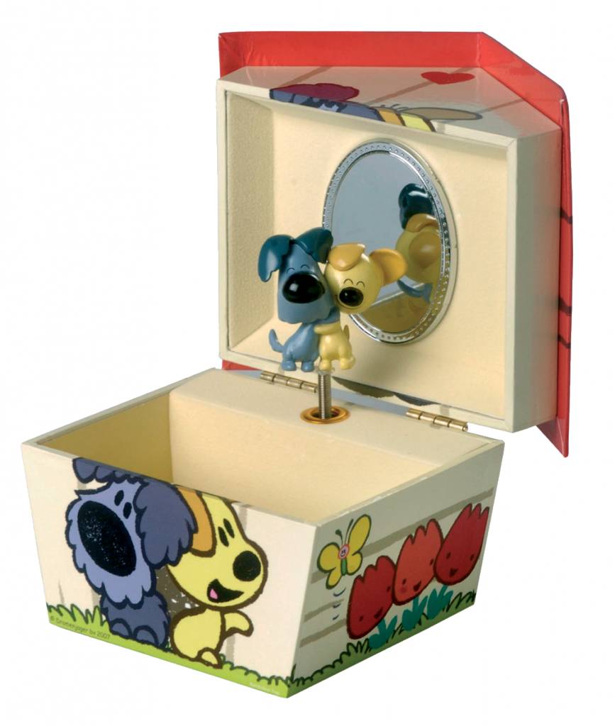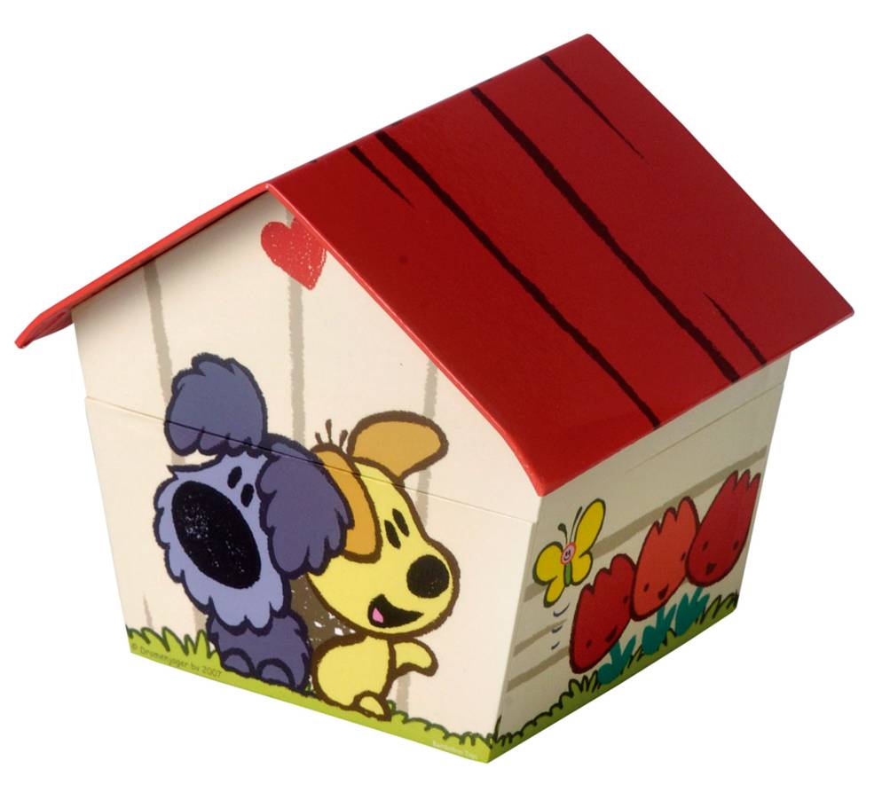 Muziekdoosje in de vorm van het hondenhok van Woezel en Pip. Als je het doosje opent dansen Woezel en Pip voor de spiegel en speelt het bekende ‘lalala’-muziekje. Dit is een decoratief artikel met speelwaarden zoals bijv. kiekeboe, herhalen, luisteren etc.