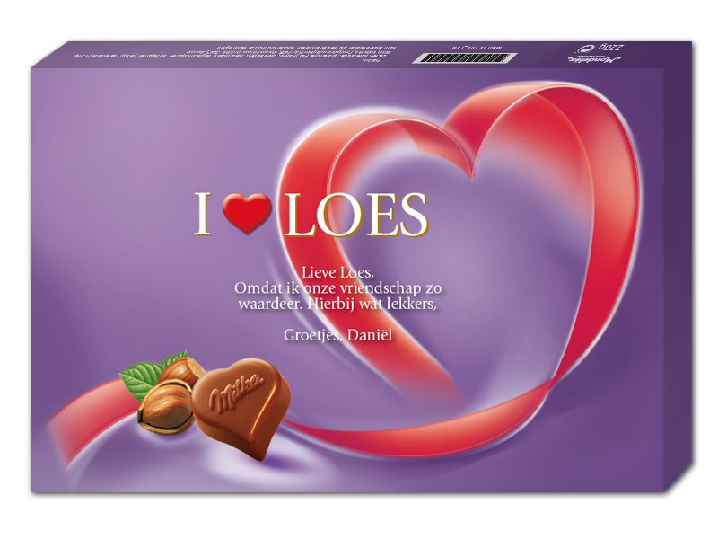 Maak je eigen verpakking, schrijf een persoonlijk bericht en je Milka geschenkverpakking wordt binnen enkele dagen per post bezorgd. Kies hieronder uw gewenste verzenddatum. Deze chocobox bevat 40 hartvormige pralines met hazelnoot-nougatcrémevulling.