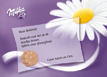 Zeg het met Milka! Maak je eigen verpakking, je Milka geschenkverpakking wordt binnen enkele dagen per post bezorgd. Naam ontvanger en wenstekst op de voorzijde. Je persoonlijke boodschap aan de binnenzijde, een foto is optioneel.